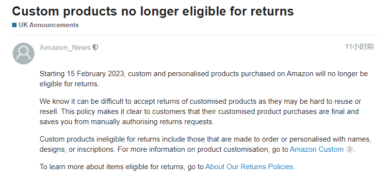 那么什么是定制產品呢?亞馬遜表示,不允許退貨的定制產品包括定制產品或有定制名稱.個性化產品的設計或銘文。