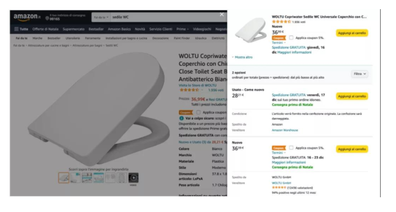 在亞馬遜的一個馬桶座圈產(chǎn)品發(fā)現(xiàn),亞馬遜本身并不直接銷售該產(chǎn)品,買家只能從第三方銷售商那里買到。亞馬遜在購買框中提供了WOLTU GmbH,該商品是由亞馬遜發(fā)貨的,因為WOLTU GmbH使用FBA。而且,買家還可以通過亞馬遜Prime享受免費的加急快遞服務(wù)。